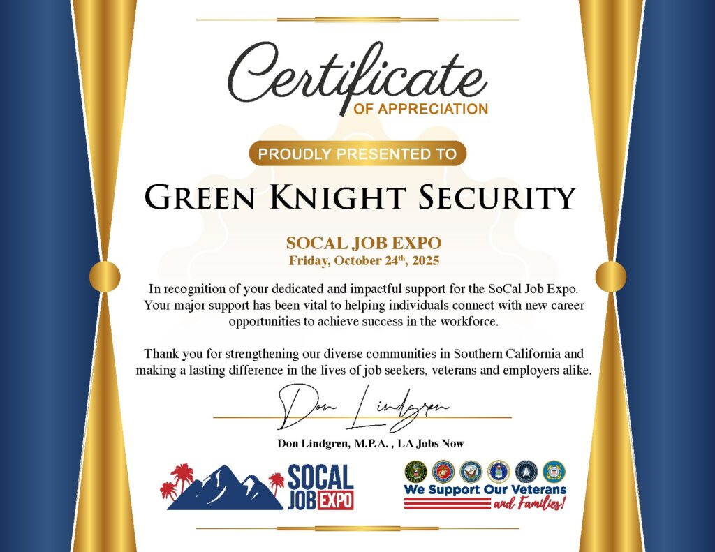 Green Knight Security requires all candidates to complete a thorough hiring process that involves a preliminary application; a series of interviews; verification of employment; reference checks; drug testing; and a full background check, including criminal and civil court history, worker’s compensation report, and motor vehicle report. If you meet our evaluation criteria, you’ll then work to obtain a Guard Card from the Bureau of Security and Investigative Services (BSIS).